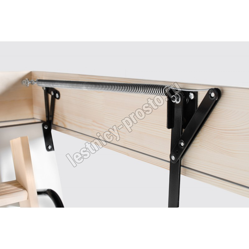 Лестница раздвижная двухсекционная, изготовлена из сосны. Термоизоляционная крышка типа "сэндвич" имеет усиленную теплозащиту, облицована с двух сторон ДСП белого цвета. По контуру короба имеется уплотнитель. Все металлические элементы лестницы покрыты порошковой краской, ступени лестницы имеют антискользящие насечки и закреплены в столярное соединение «ласточкин хвост», что позволяет выдерживать нагрузку 150 кг. При раскладывании лестницы нет вылета за пределы короба, что позволяет использовать эту модель лестницы в таких помещениях, где невозможно использовать чердачные лестницы с большим разбегом открытия. Удобна для эксплуатации на большой высоте. Деревянный стержень для открывания лестницы в комплекте..