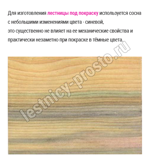 В производстве лестницы К-001м/1 под покраску используется сосна с небольшими изменениями цвета, что практически не влияет на ее механические свойства и почти незаметно при покраске в темные цвета. Базовый комплект включает в себя элементы лестницы и ограждения без какого-либо покрытия.
