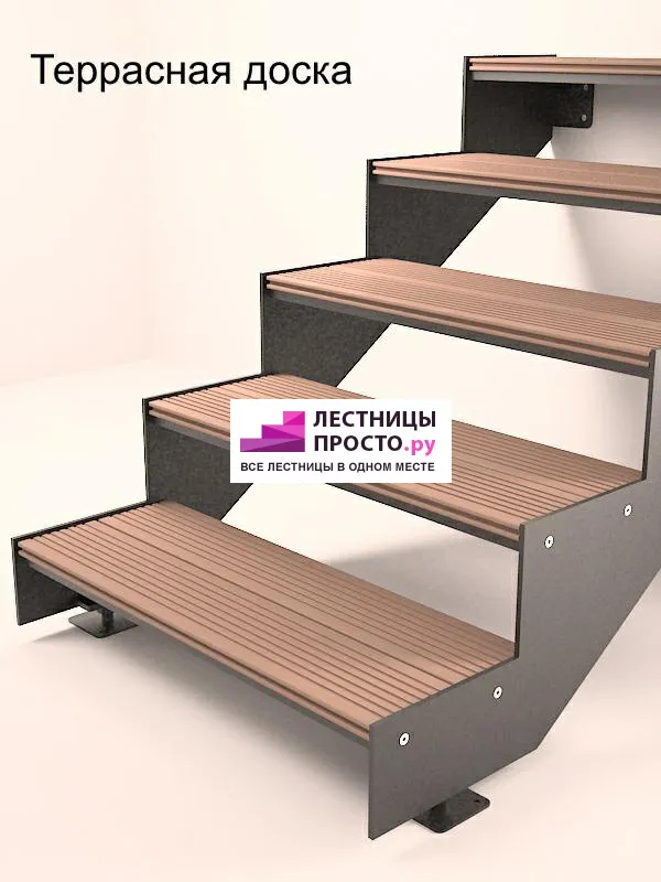 Ступени лестницы состоят из металлической рамки, обеспечивающей необходимую прочность, и покрытия из террасной доски ДПК (древесно-полимерный композит). Ступени не боятся воды и мороза, не теряют со временем свой внешний вид и не требуют ухода.