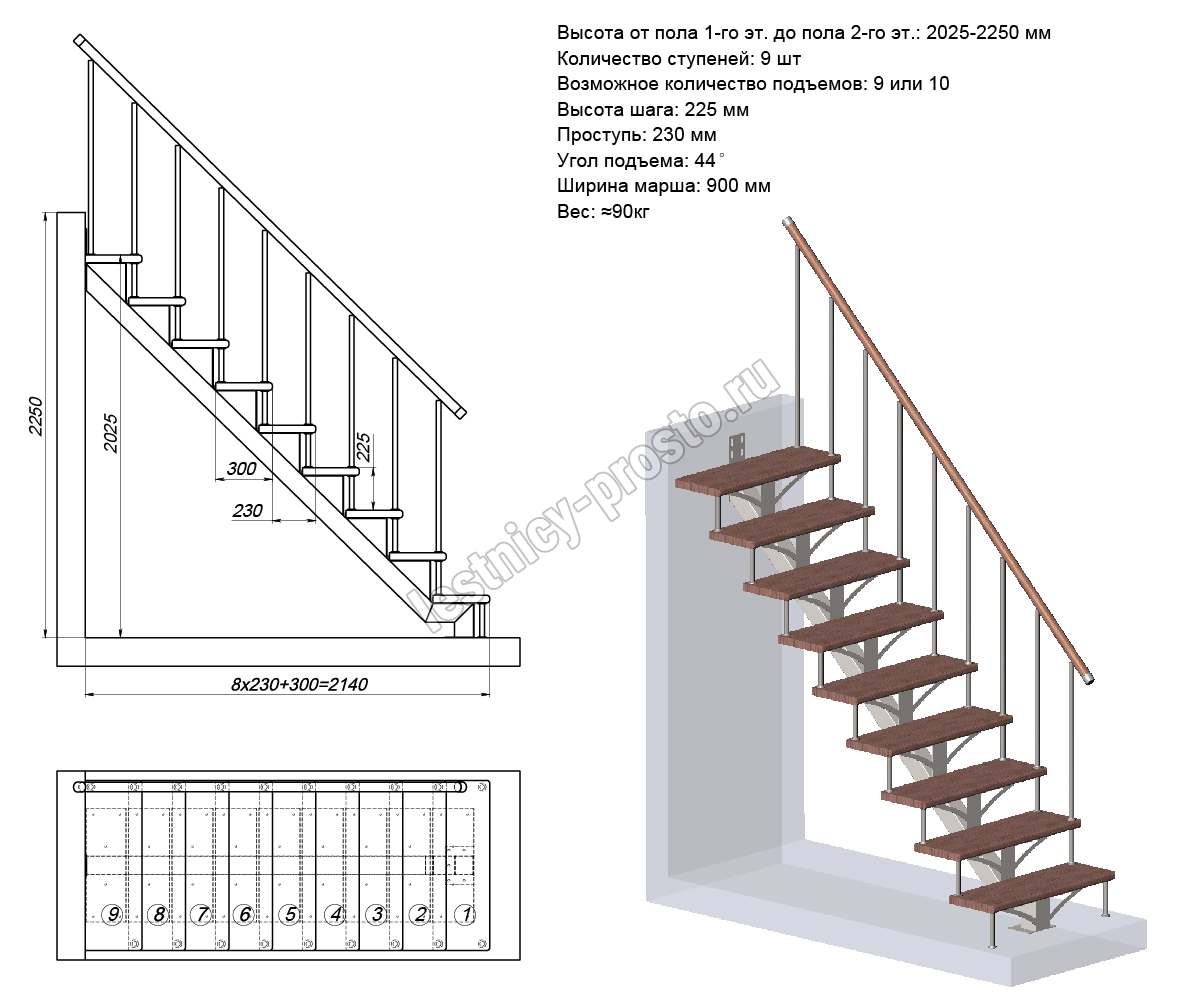 Лестница PROSTO MONO прямая, h225 см, ступени лиственница