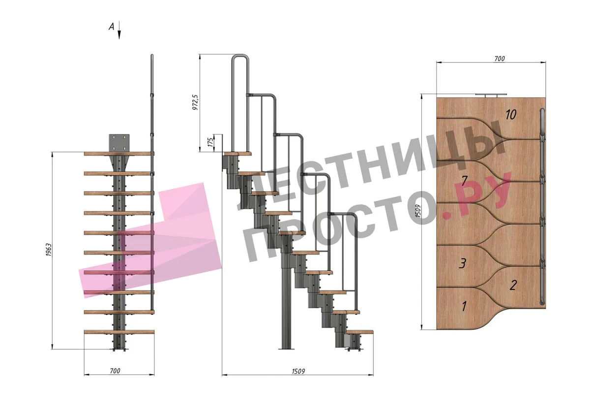 Лестница Prosto Urban Black гусиный шаг 700 мм, h180-264 см (10 ступеней) берёза мультиплекс