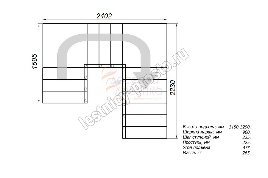 Модульная лестница Комфорт 225 3150-3290, Черный, Лиственница, Нержавеющая сталь
