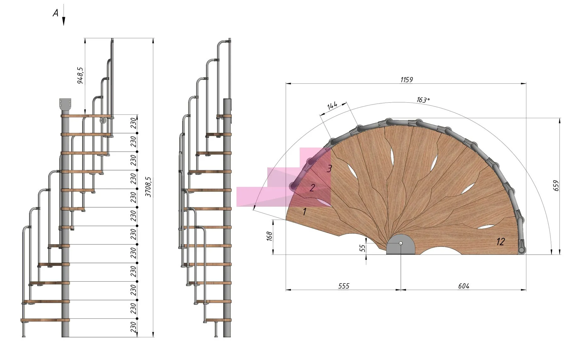 Винтовая лестница PROSTO MINI 60×120 см, h276-299 см
