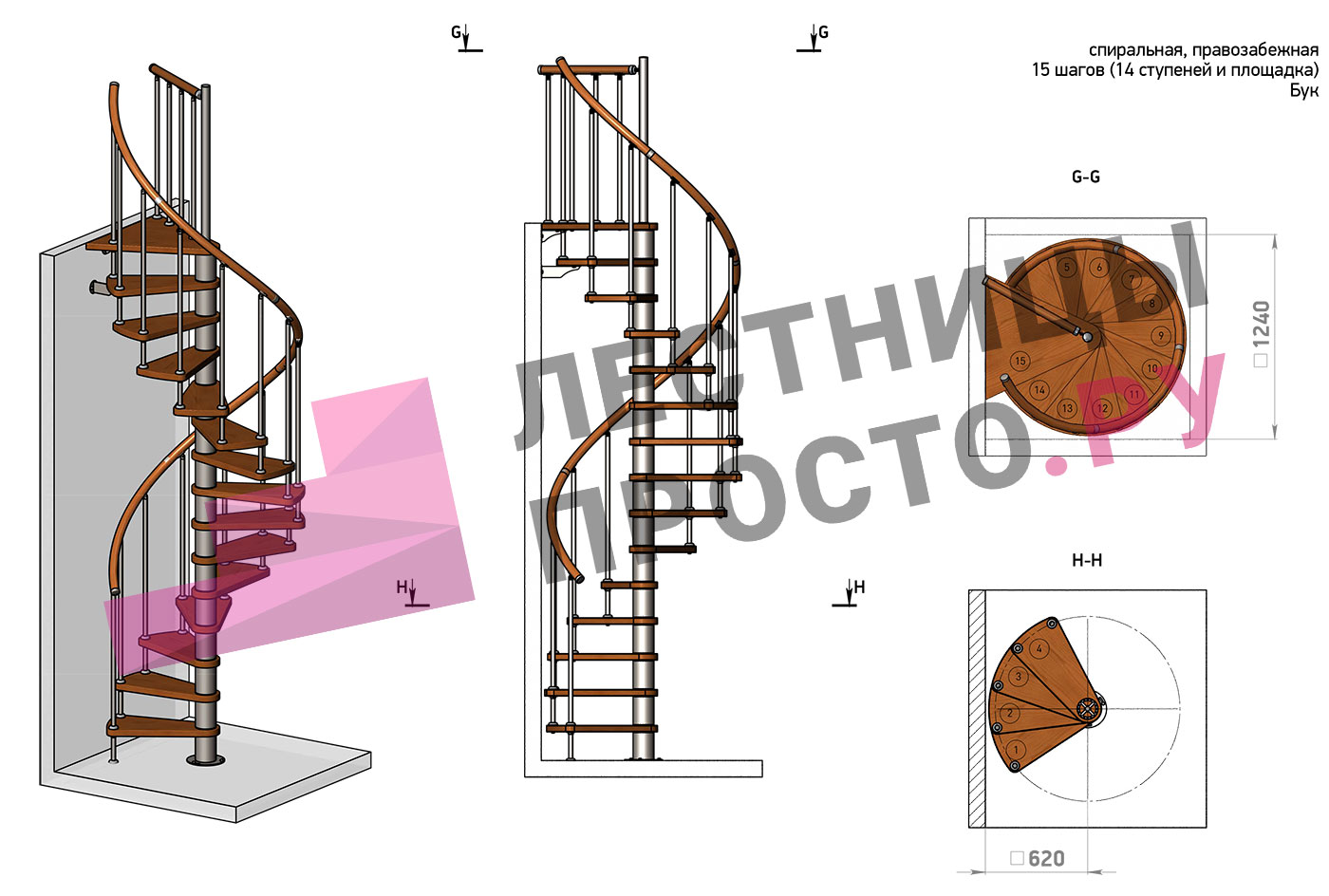 Правая, d=120см, 14 ступеней + площадка