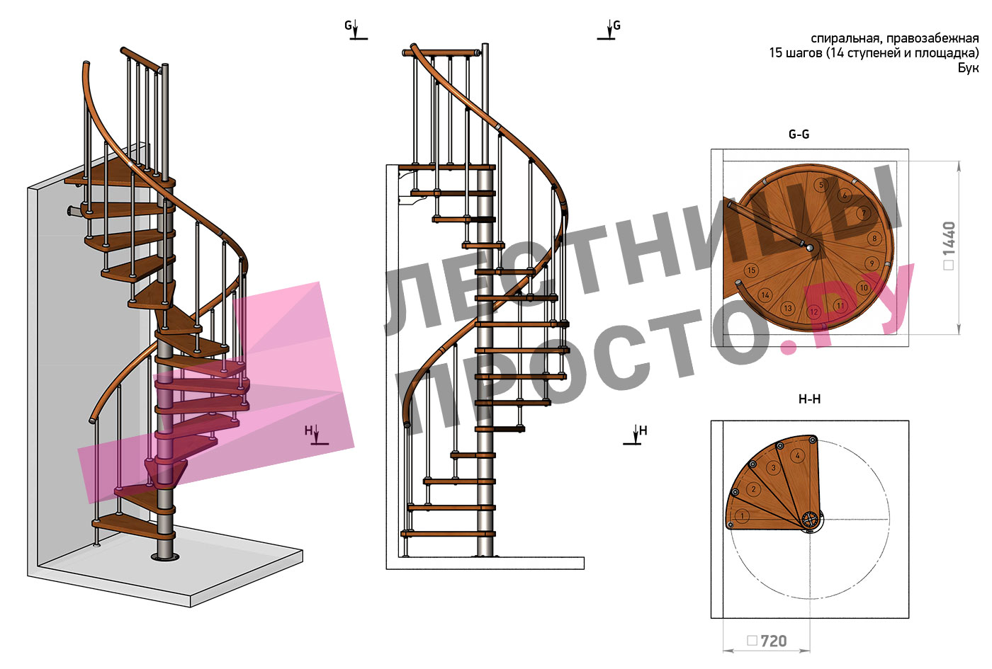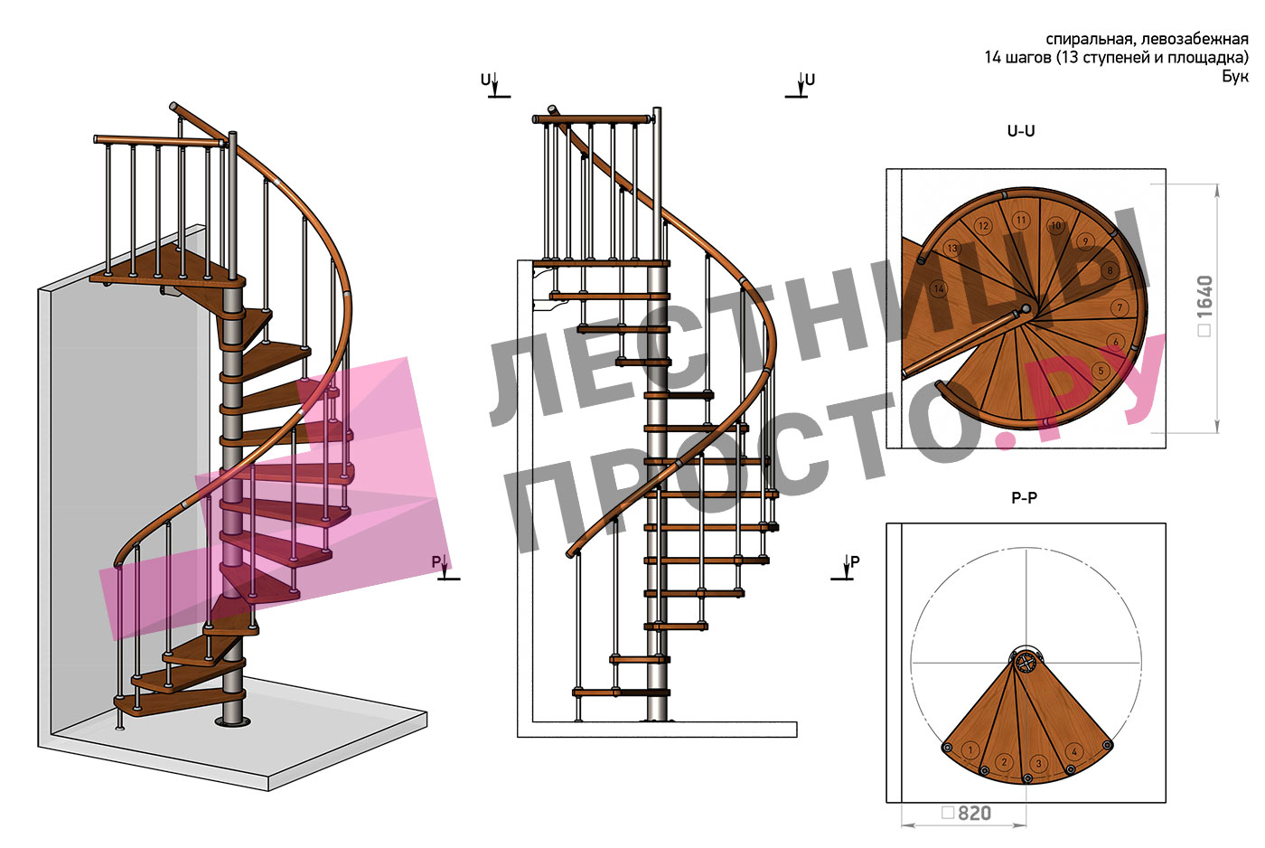 | Винтовая лестница Prosto Spiral Black D140см, h303.9-348,1 см, бук |