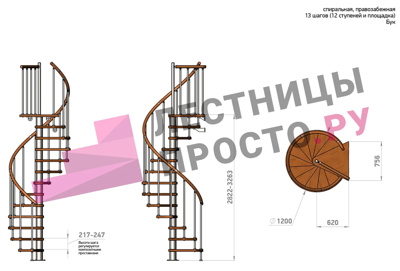 Правая, d=120см, 13 ступеней + площадка