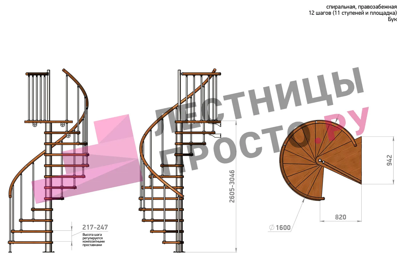Правая, d=160см, 12 ступеней + площадка