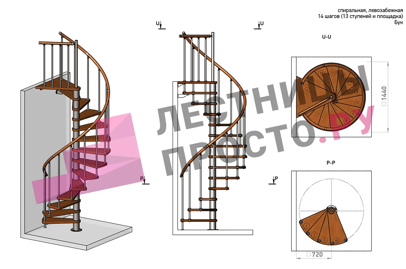 Левая, d=140см, 14 ступеней + площадка