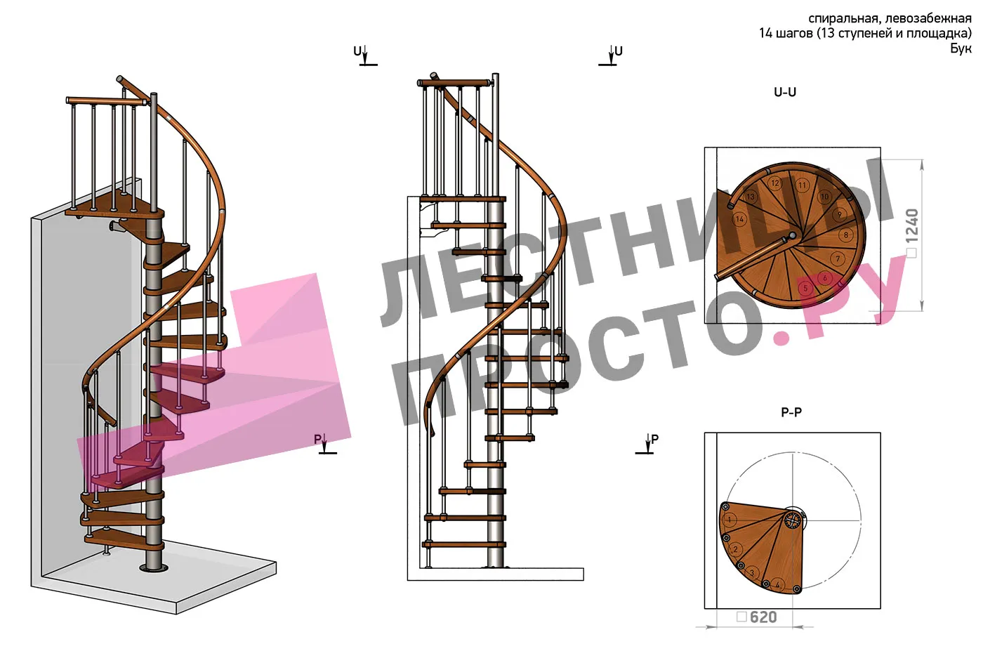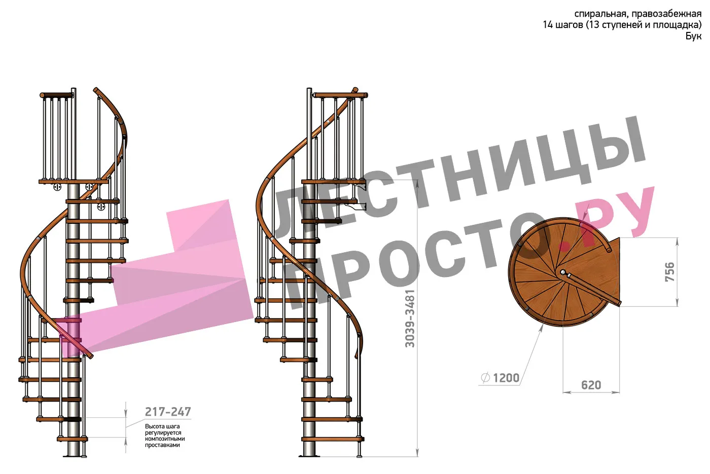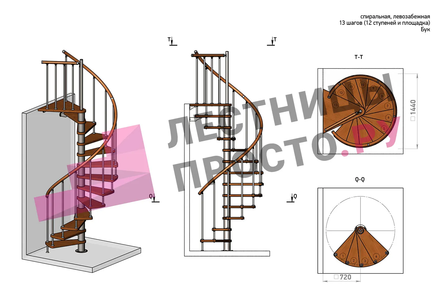 | Винтовая лестница Prosto Spiral White D140см, h325.7-369.8 см, бук |