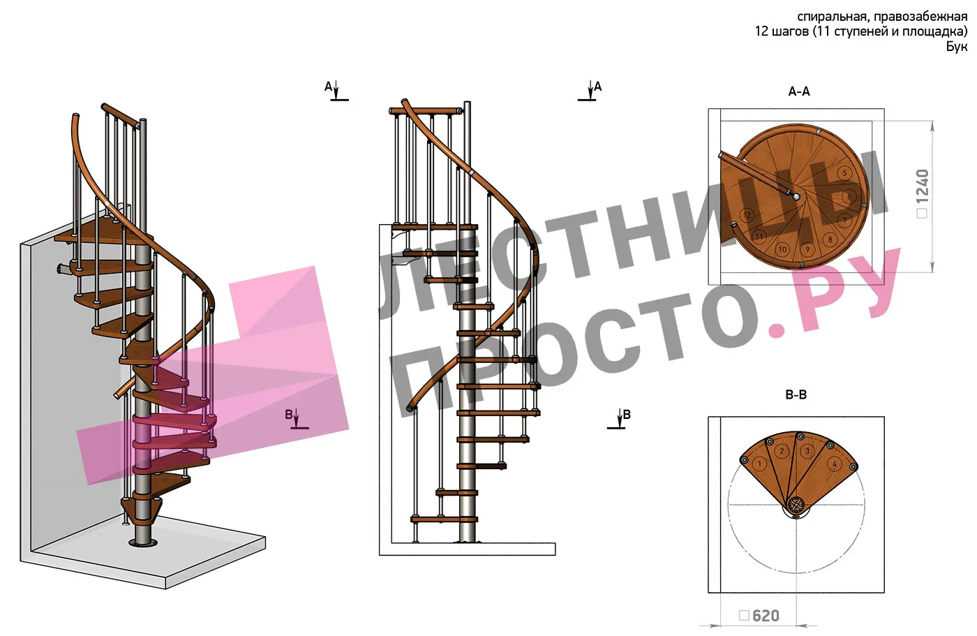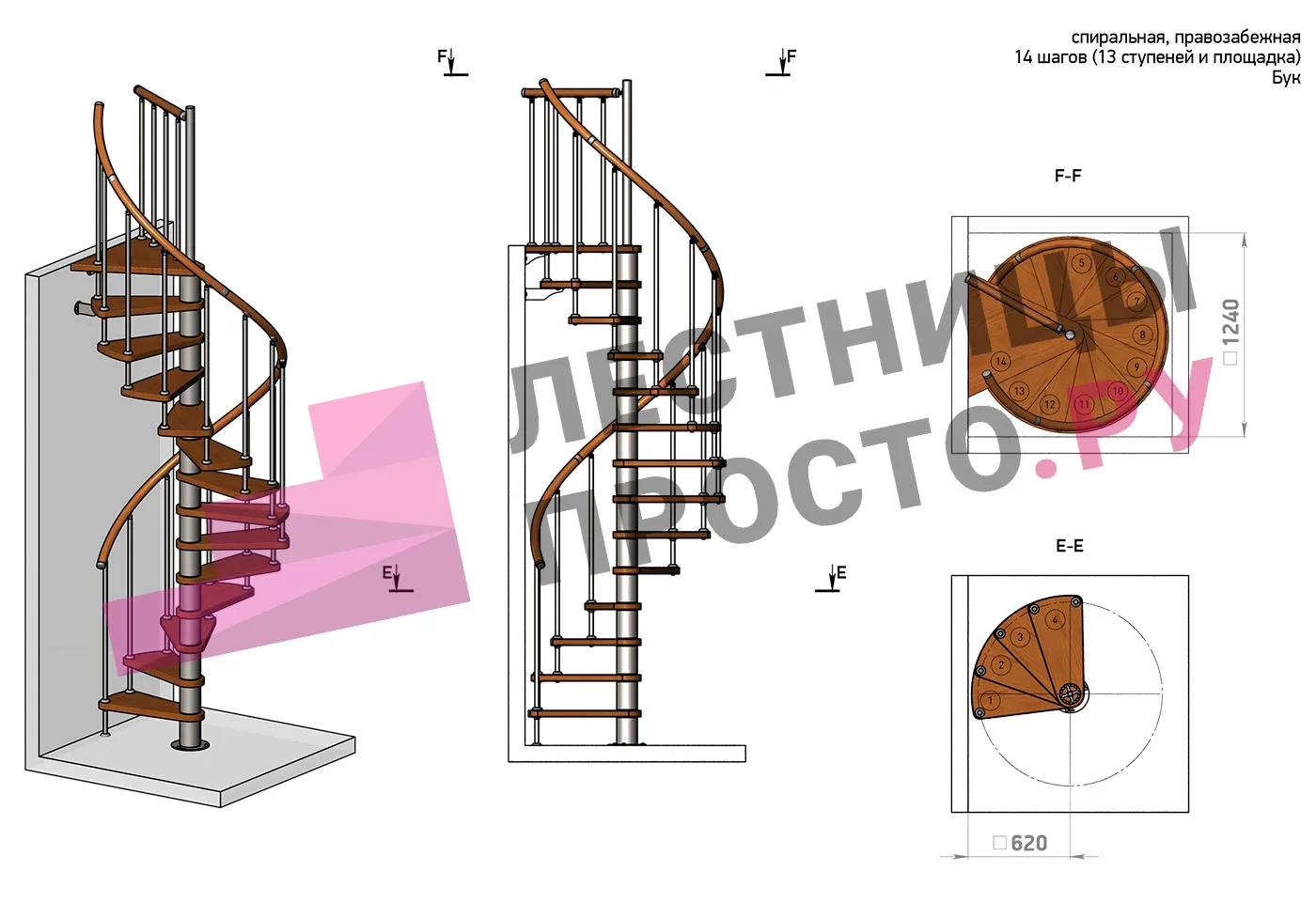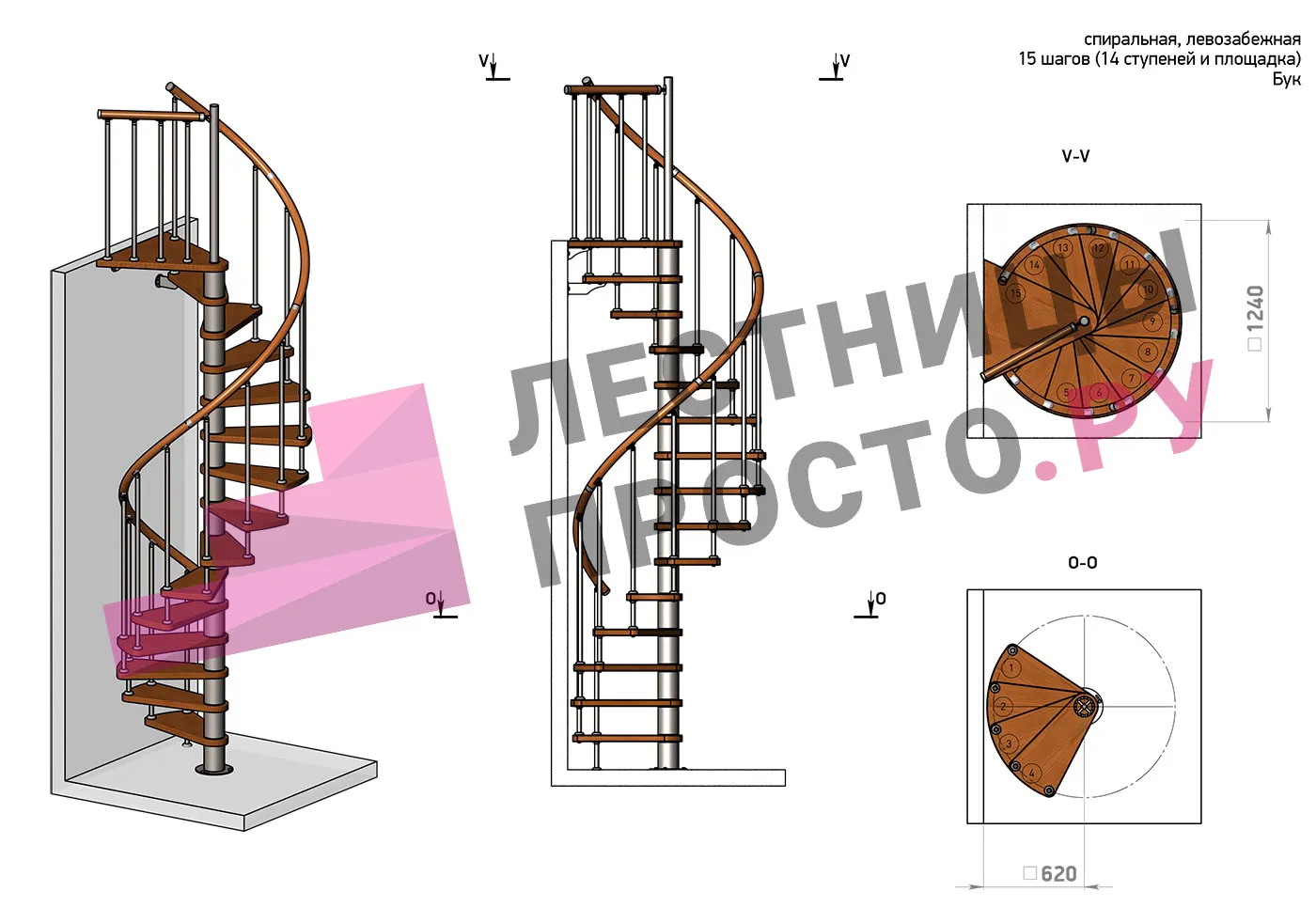 | Винтовая лестница Prosto Spiral White D140см, h325.7-369.8 см, бук |