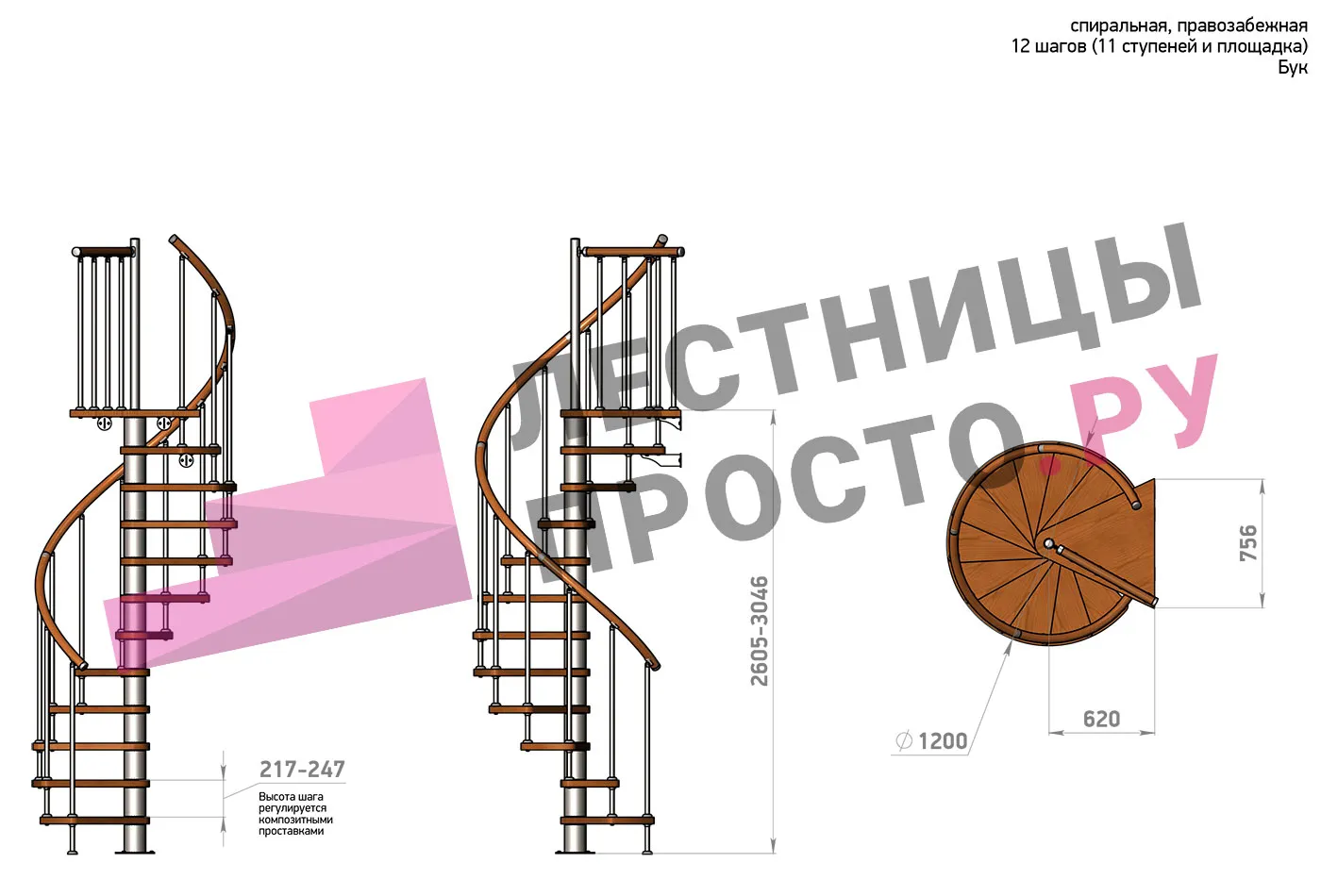 | Винтовая лестница Prosto Spiral White D120см, h260.5-304.6 см, бук |