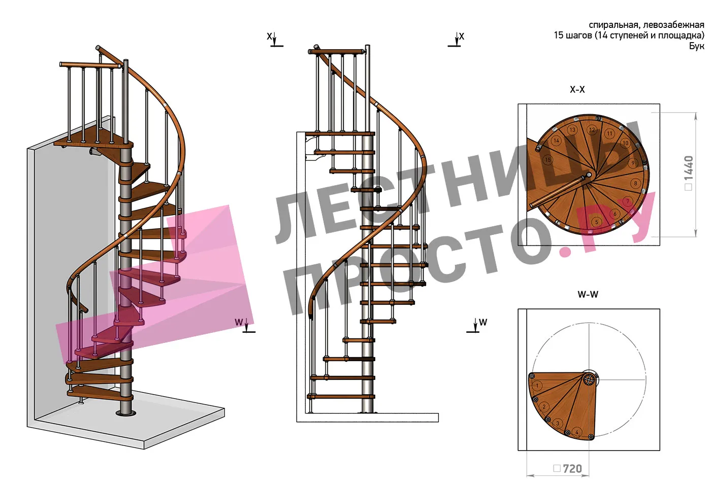| Винтовая лестница Prosto Spiral White D140см, h303.9-348,1 см, бук |