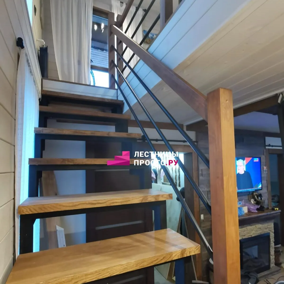 Металлическая лестница с отделкой из дерева в частном доме LP-1-38